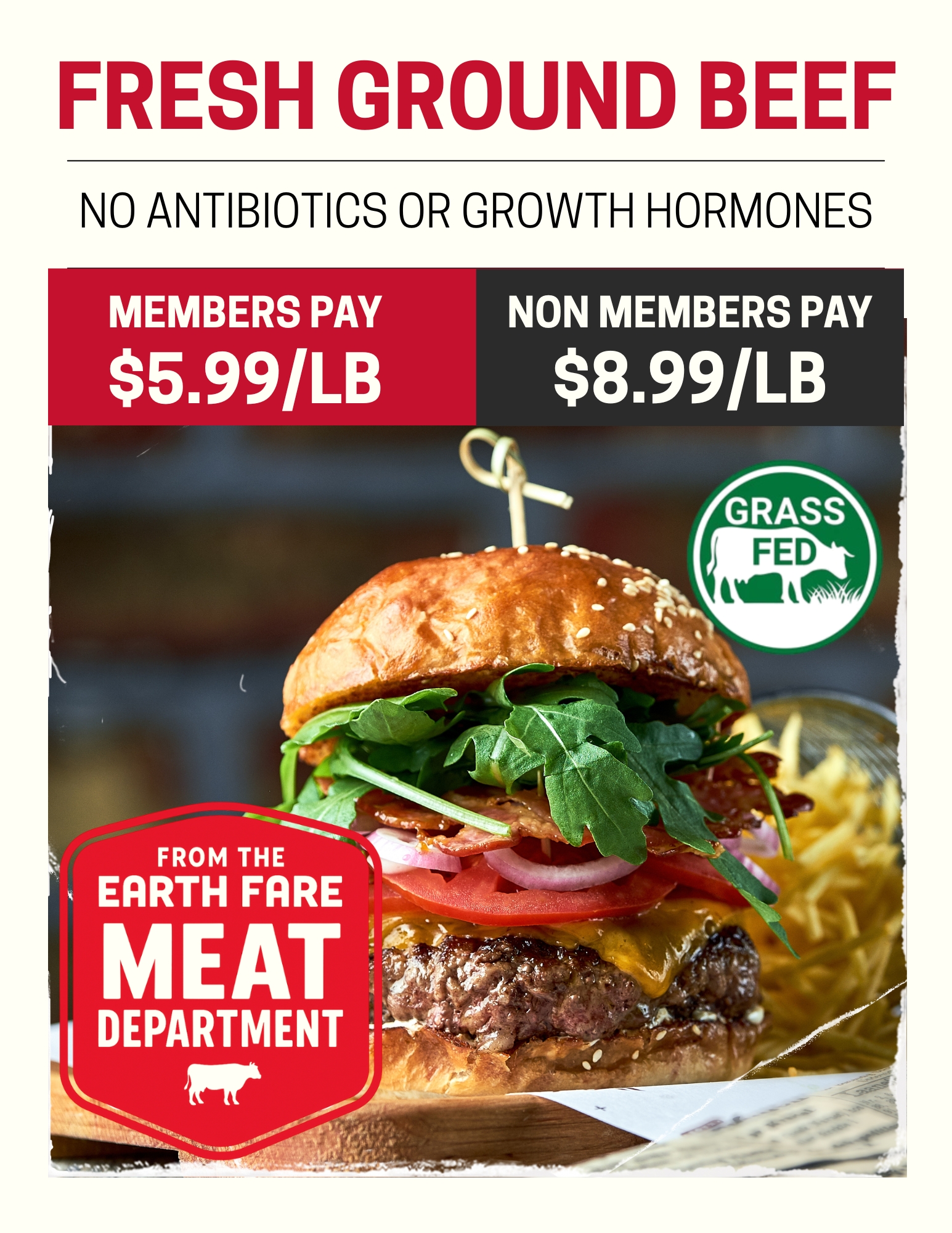 Guaranteed American Humane Certified boneless skinless chicken breasts from the Earth Fare meat department & Grass Fed Ground Beef for only $4.99/lb.