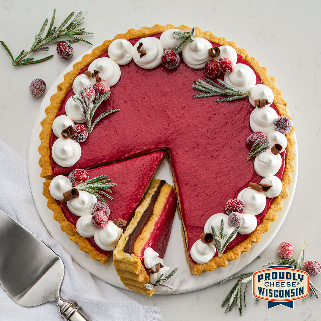 | 11. | Spread eggnog cream over ganache. Refrigerate for 15 minutes. Spread cranberry curd over top. Refrigerate for at least 30 minutes longer or until set. Garnish with whipped cream, sugared berries and rosemary, and chocolate curls. |