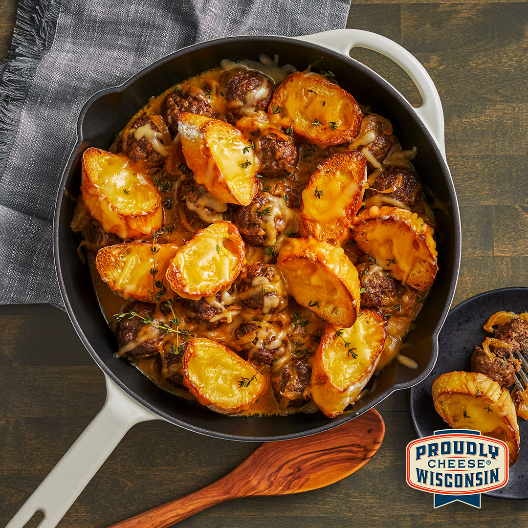 7. | Stir in the rosemary, remaining thyme and garlic. Cook and stir for 2 minutes. Gradually add beef broth. Bring to a boil, stirring frequently. Reduce heat to low. Simmer, uncovered, for 4 minutes, stirring occasionally. Gradually stir in 1/2 cup butterkase until melted. Add meatballs; heat through. |